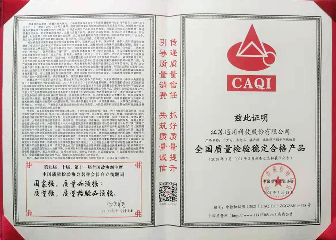 產(chǎn)品質(zhì)量是企業(yè)發(fā)展的基礎(chǔ),作為中國民族輪胎領(lǐng)軍企業(yè)之一,通用股份秉持“讓每一條輪胎成為精品”的企業(yè)使命,全方位深耕質(zhì)量管理,建立了嚴(yán)苛的產(chǎn)品質(zhì)量標(biāo)準(zhǔn),完善的內(nèi)部質(zhì)量監(jiān)控和管理體系,并形成了獨(dú)具特色的《質(zhì)量三字經(jīng)》、《輪胎當(dāng)自強(qiáng)》等質(zhì)量文化,從思想上引導(dǎo)、提升、深化全員質(zhì)量意識。公司從原材料采購、生產(chǎn)制造到產(chǎn)品出廠,全面貫徹“質(zhì)量一票否決制”,一旦有產(chǎn)品質(zhì)量方面的問題,絕對不允許進(jìn)入下一道工序,嚴(yán)把質(zhì)量關(guān),確保為客戶提供高質(zhì)量的優(yōu)質(zhì)產(chǎn)品。
