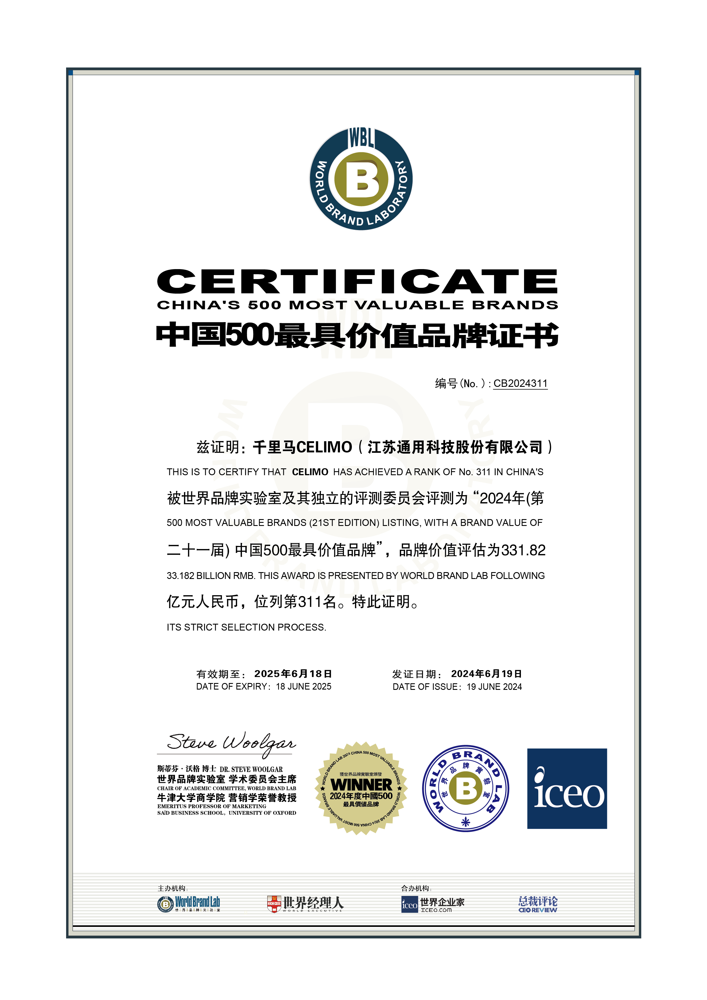 619日,世界品牌實驗室(World Brand Lab)主辦的第二十一屆“世界品牌大會”在京圓滿落幕。會上隆重揭曉了2024年“中國500最具價值品牌”榜單,通用股份旗下千里馬CELIMO品牌憑借331.82億元人民幣的品牌價值,排名躍升至榜單第311位,連續六年獲此殊榮,彰顯了其強大的品牌實力。